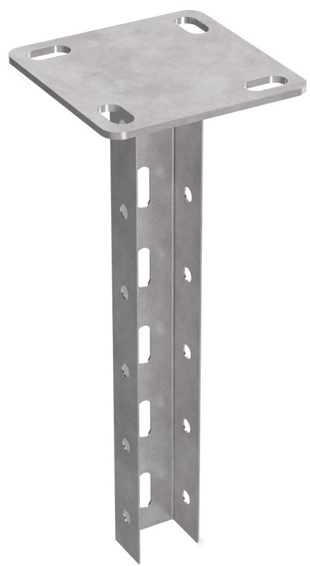 Стойка потолочная для средних нагрузок 45х30 с пяткой 120х120 это опорное изделие, состоящее из П-образного профиля и прямоугольного основания, сваренных между собой. П - образный профиль и прямоугольное основание из стальной пластины 4 мм. позволяют крепить стойку к потолку. Разные исполнения по длине данного изделия дают возможность подбирать оптимальный вариант для формирования нужных конструкций. Вдоль всего профиля имеется перфорация по трем плоскостям, обеспечивающая удобный монтаж стоечного кронштейна и двухстороннего стоечного кронштейна на необходимой вам высоте.