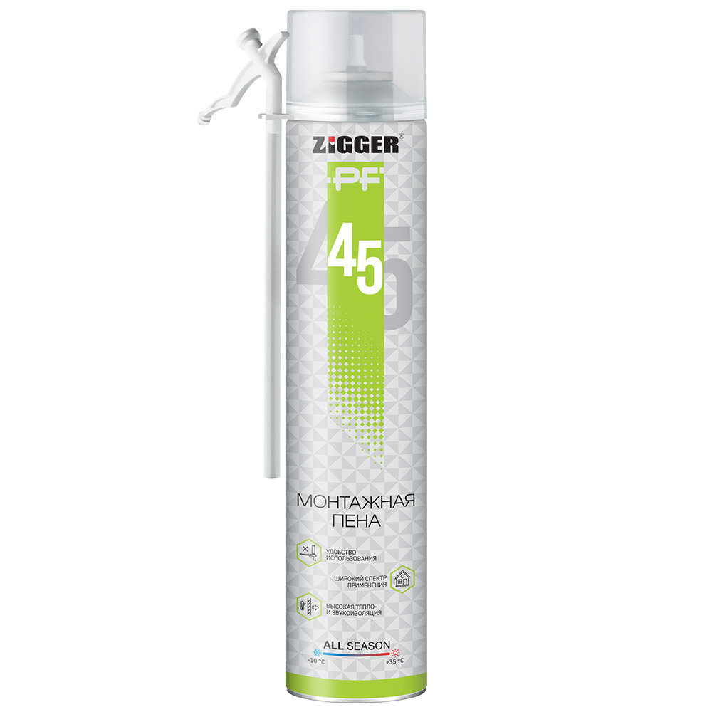 Пена монтажная Zigger PF, бытовая, всесезонная, выход до 45 л, 650 г представляет собой oднокомпонентную полиуретановую пену, предназначенную для применения с помощью монтажного пистолета. Объемный выход сформированной пены из упаковки составляет до 65 литров. Под воздействием влаги воздуха или введенной влаги продукт превращается в полутвердую эластичную полиуретановую пену.