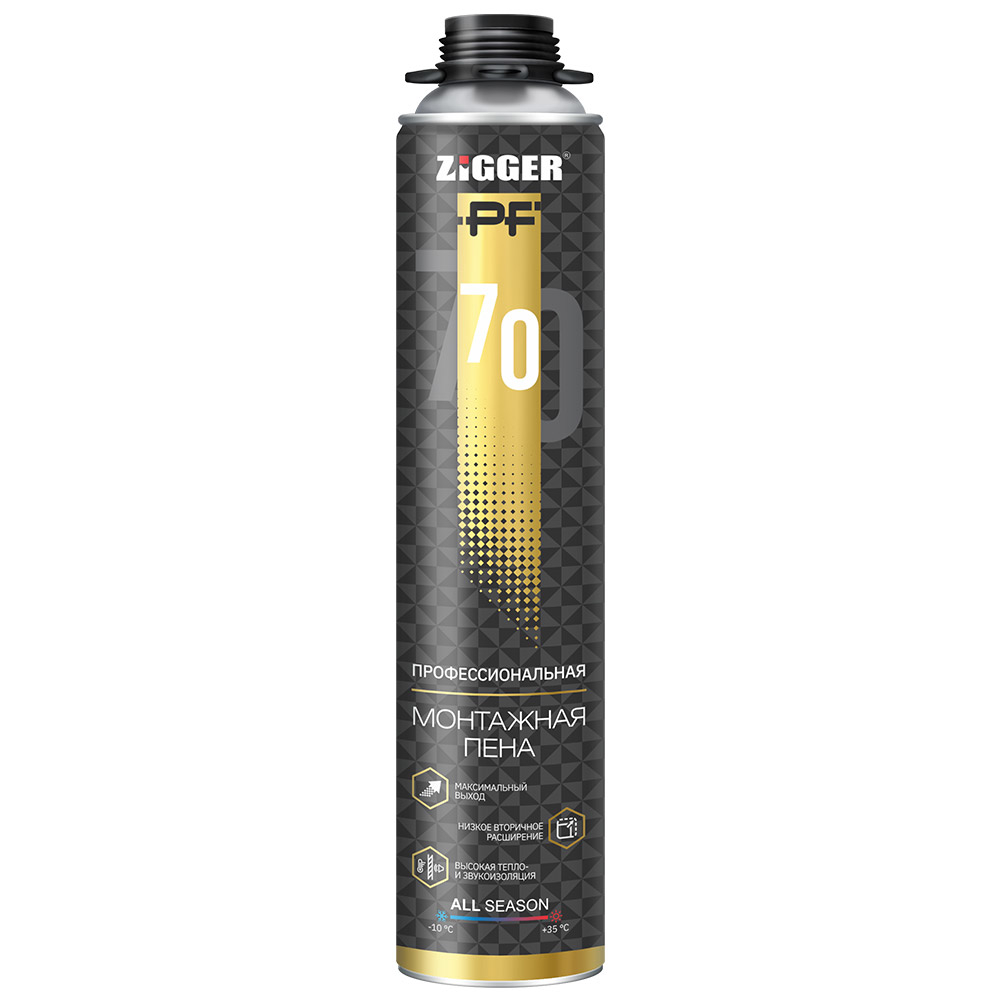 Пена монтажная ZIGGER PF - высококачественная однокомпонентная полиуретановая пена была произведена по немецкой технологии, и отлично подходит для заполнения швов, щелей, пустот, герметизации дверных и оконных проемов, создания звукоизоляционных экранов, термоизоляции в системах отопления и охлаждения, а также для других ремонтных работ.