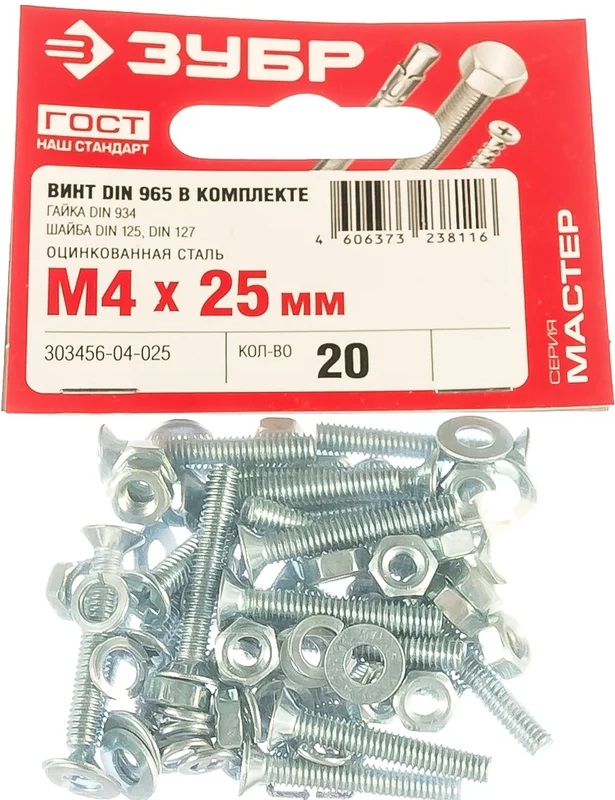 Винты оцинкованные потай Зубр DIN 965 М 4х25 с гайкой и шайбой (20шт)