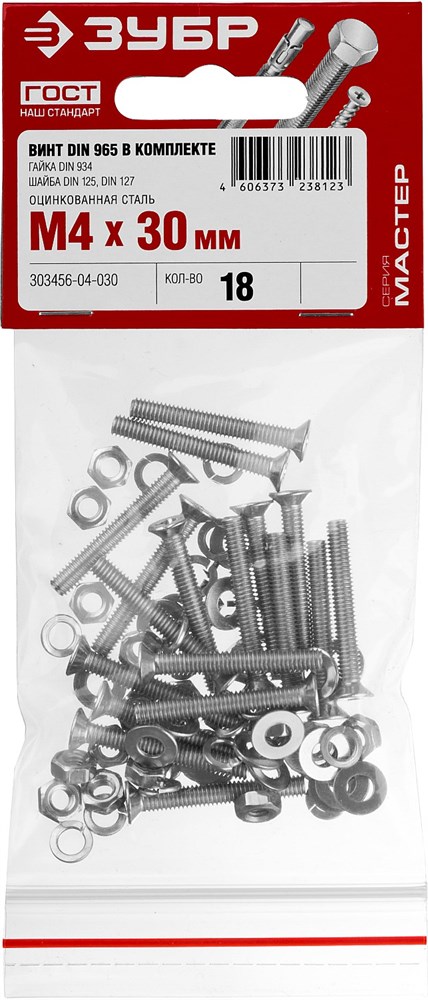 Винты оцинкованные потай Зубр DIN 965 М 4х30 с гайкой и шайбой (18шт)