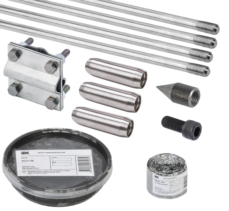 Комплект заземления товарного знака IEK используется для организации заземляющего устройства жилых объектов, объектов энергетического и промышленного комплексов, объектов связи. Данный комплект монтируется на глубину 6 метров путём последовательного соединения и заглубления стержней с помощью перфоратора или кувалды.