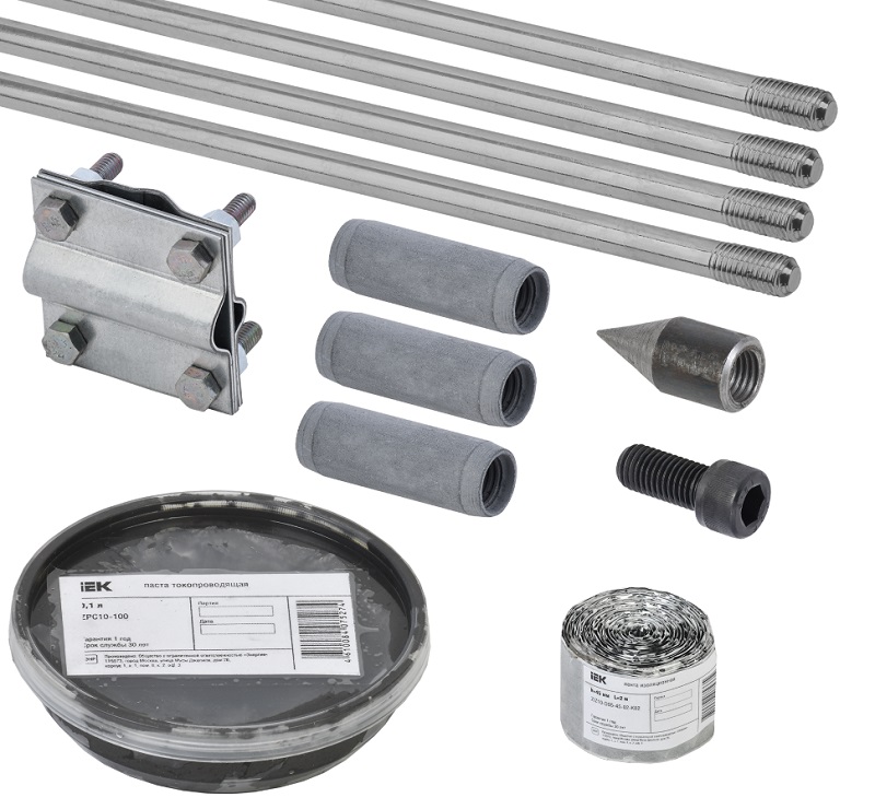 Комплект заземления товарного знака IEK используется для организации заземляющего устройства жилых объектов, объектов энергетического и промышленного комплексов, объектов связи. Данный комплект монтируется на глубину 6 метров путём последовательного соединения и заглубления стержней с помощью перфоратора или кувалды.