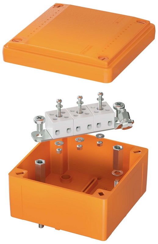 Предназначение огнестойких ответвительных коробок – соединение и ответвление проводов и кабелей с сохранением работоспособности при пожаре. Коробки применяются в составе огнестойких кабельных линий и прошли испытания в соответствии с ГОСТ Р 53316 с продукцией различных кабельных заводов. Материал – специальный термопласт, цвет – оранжевый, RAL2003. В комплект поставки коробок входят керамические клеммники, а также огнестойкие метизы (монтажная пластина, анкера, винты, шайбы, гайки).