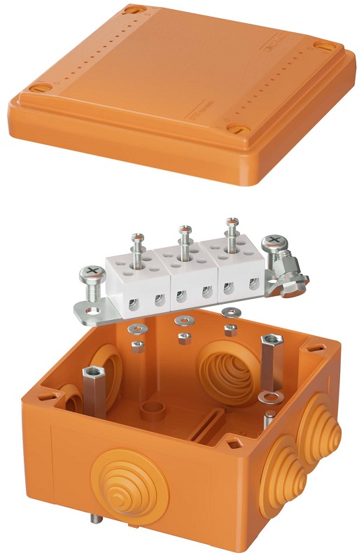 Предназначение огнестойких ответвительных коробок – соединение и ответвление проводов и кабелей с сохранением работоспособности при пожаре. Коробки применяются в составе огнестойких кабельных линий и прошли испытания в соответствии с ГОСТ Р 53316 с продукцией различных кабельных заводов. Материал – специальный термопласт, цвет – оранжевый, RAL2003. В комплект поставки коробок входят керамические клеммники, а также огнестойкие метизы (монтажная пластина, анкера, винты, шайбы, гайки).