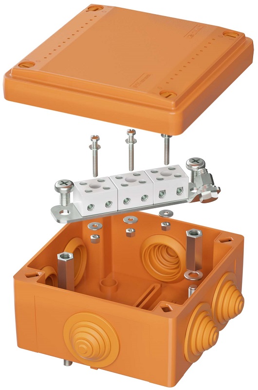 Предназначение огнестойких ответвительных коробок – соединение и ответвление проводов и кабелей с сохранением работоспособности при пожаре. Коробки применяются в составе огнестойких кабельных линий и прошли испытания в соответствии с ГОСТ Р 53316 с продукцией различных кабельных заводов. Материал – специальный термопласт, цвет – оранжевый, RAL2003. В комплект поставки коробок входят керамические клеммники, а также огнестойкие метизы (монтажная пластина, анкера, винты, шайбы, гайки).