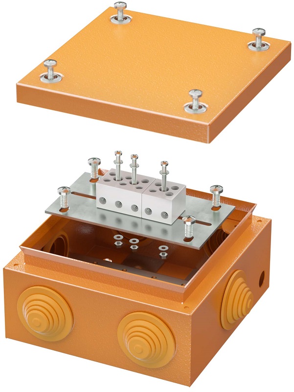 Предназначение огнестойких ответвительных коробок – соединение и ответвление проводов и кабелей с сохранением работоспособности при пожаре. Коробки применяются в составе огнестойких кабельных линий и прошли испытания в соответствии с ГОСТ Р 53316 с продукцией различных кабельных заводов. Материал – специальный термопласт, цвет – оранжевый, RAL2003. В комплект поставки коробок входят керамические клеммники, а также огнестойкие метизы (монтажная пластина, анкера, винты, шайбы, гайки).
