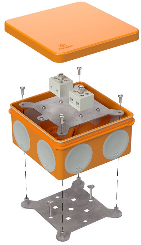 ЭМК двухкомпонентные огнестойкие сочетают в себе надежность и высокую скорость монтажа. Они применяются при прокладке систем противопожарной безопасности по различным поверхностям зданий и сооружений, необходимы для механической защиты мест соединения проводов и кабелей, а так же для защиты от проникновения пыли, влаги и посторонних предметов. Лаконичный дизайн способствует эстетичному монтажу проводки, а мембраны позволяют увеличить скорость монтажа (по сравнению со скоростью при использовании ЭМК с гермовводами). Материал изготовления коробок является безгалогенным, что позволяет использовать изделие в общественных местах с высоким скоплением людей. Коробка имеет монолитное исполнение с уплотнителем и мембранами за счёт чего достигается высокая степень защиты IP66.