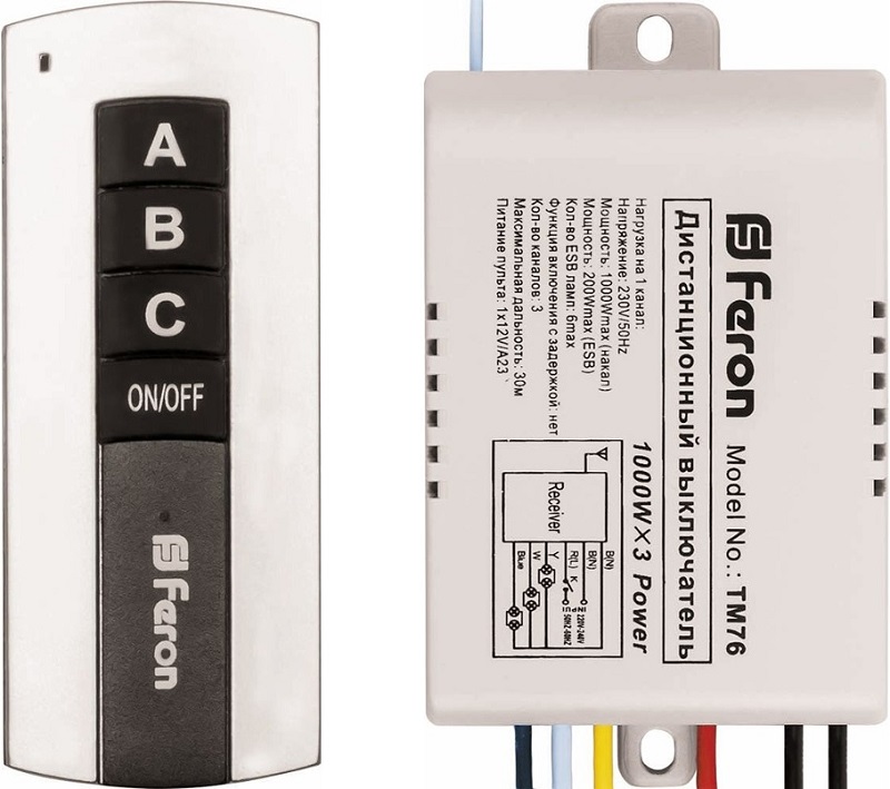 Дистанционный выключатель Feron может коммутировать от одного до трех потребителей электрической цепи. Мощность нагрузки каждого потребителя. Данное устройство широко используется в многоламповых светильниках, а так же по выбору потребителя может применяться для управления различной бытовой электроникой.