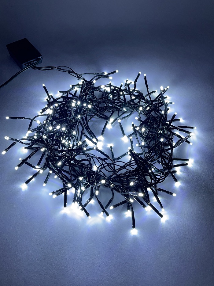 Гирлянда работает от стандартной электросети 220 В и потребляет минимальное количество электроэнергии. В ней установлено 200 светодиодов последнего поколения, это яркие и одновременно экономичные источники света