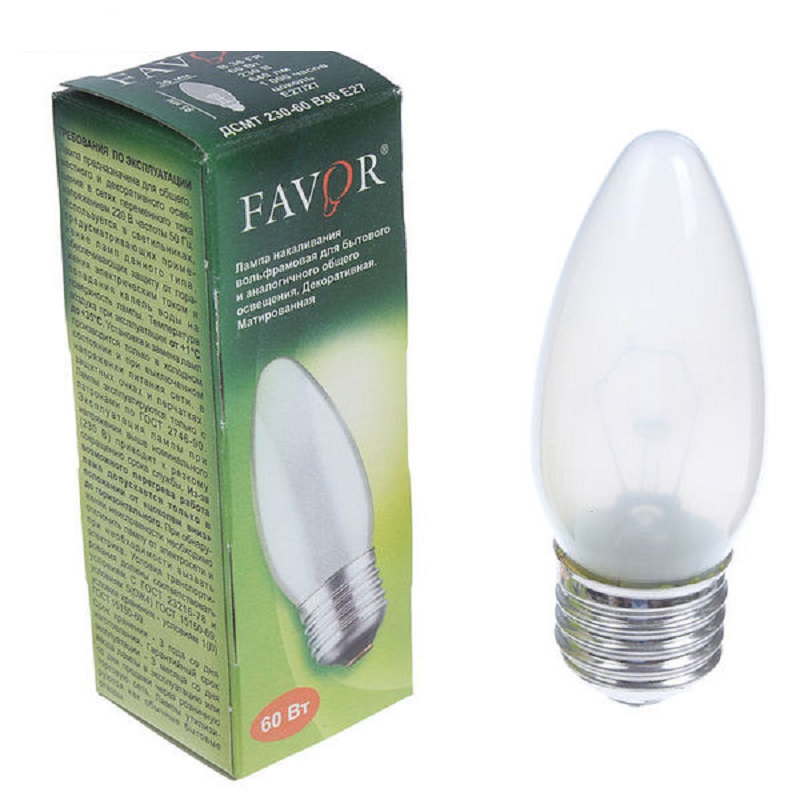 Лампы накаливания Favor это оптимальное решение для организации освещения в жилых и обеденных зонах. Лампочка изготовлена с цоколем Е27 и подходит для не глубоких или открытых плафонов со стандартным патроном.