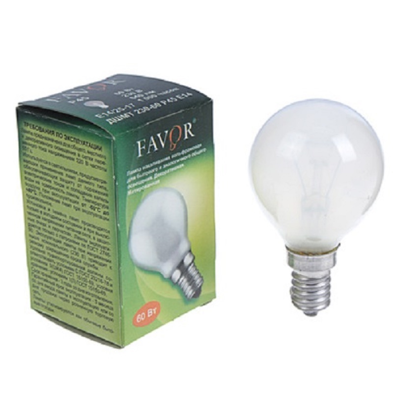Лампы накаливания Favor это оптимальное решение для организации освещения в жилых и обеденных зонах. Лампочка изготовлена с цоколем Е14 и подходит для не глубоких или открытых плафонов со стандартным патроном.