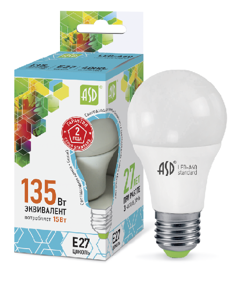 Светодиодная лампа ASD серии Standart выполнена под патрон Е27, диапазон напряжения питания 210-240 вольт и потреблении электроэнергии в 15Вт данная лампочка эквивалентна 135Вт и обеспечивает яркий световой поток в 1350Лм дневного света в 4000К.