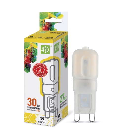 Капсульная светодиодная лампа ASD серии Standart выполнена под патрон G9, диапазон напряжения питания 210-240 вольт и потреблении электроэнергии в 3Вт данная лампочка эквивалентна 30Вт и обеспечивает ровный световой поток в 180Лм теплого света в 3000К.