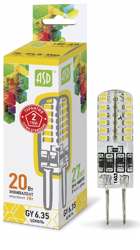 Капсульная светодиодная лампа ASD серии Standart выполнена под патрон G6,35, диапазон напряжения питания 210-240 вольт и потреблении электроэнергии в 2Вт данная лампочка эквивалентна 20Вт и обеспечивает ровный световой поток в 180Лм теплого света в 3000К.