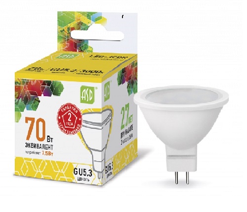 Светодиодная лампа направленного света типа софит ASD серии Standart, выполнена под патрон GU10 диапазон напряжения питания 210-240 вольт, при потреблении электроэнергии в 7,5Вт данная лампочка эквивалентна 70вт и обеспечивает ровный световой поток в 675Лм теплого света в 3000К.