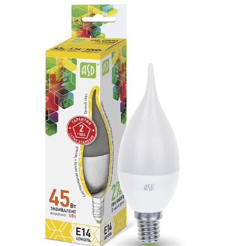 Светодиодная лампа ASD серии Standert выполнена под цоколь Е14 диапазон напряжения питания 210-240 вольт, при потреблении электроэнергии в 5Вт данная лампочка эквивалентна 45Вт обеспечивает ровный световой поток в 450Лм теплого света в 3000К.