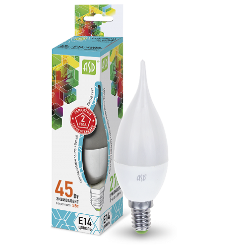 Светодиодная лампа ASD серии Standert выполнена под цоколь Е14 диапазон напряжения питания 160-260 вольт, при потреблении электроэнергии в 5Вт данная лампочка эквивалентна 45Вт обеспечивает ровный световой поток в 450Лм дневного света в 4000К.