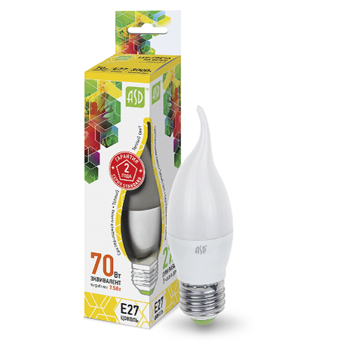 Светодиодная лампа ASD серии Standert выполнена под цоколь Е27 диапазон напряжения питания 210-240 вольт, при потреблении электроэнергии в 7,5Вт данная лампочка эквивалентна 70Вт обеспечивает ровный световой поток в 675Лм теплого света в 3000К.