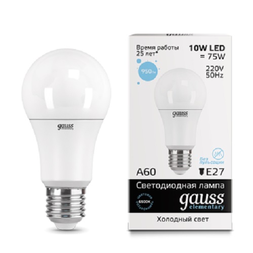 Лампа светодиодная Gauss Elementary А60 Груша E27 220В 10Вт 540Лм 6500К 60х110мм картинка