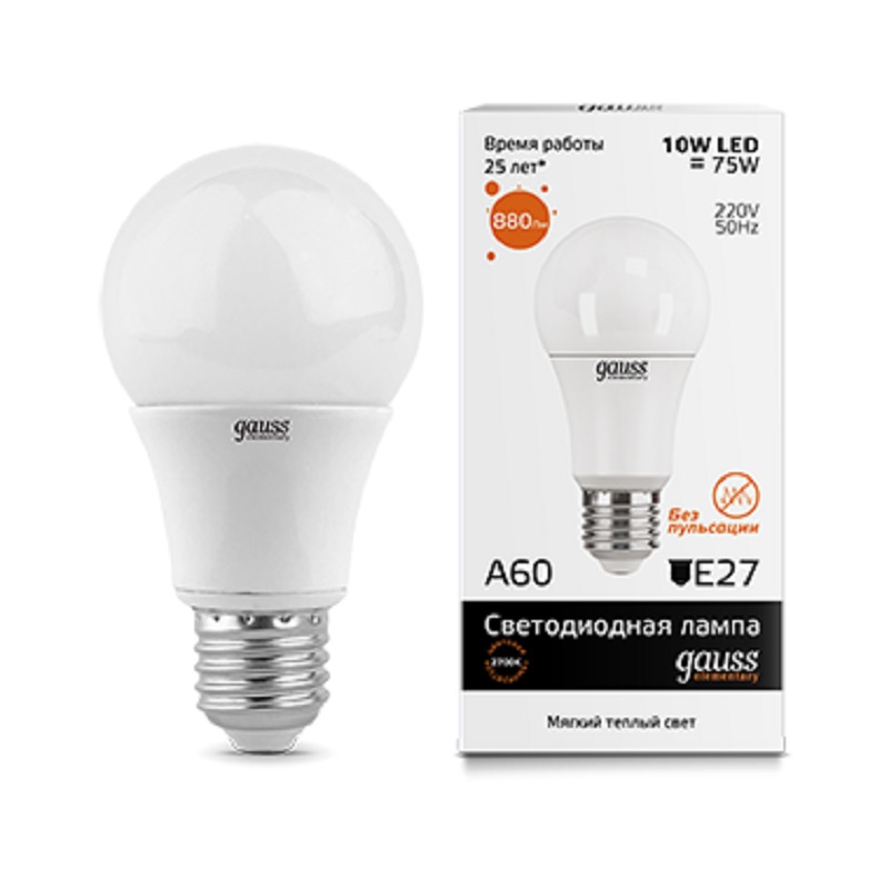 Лампа светодиодная Gauss Elementary А60 Груша E27 220В 10Вт 880Лм 2700К 60х110мм