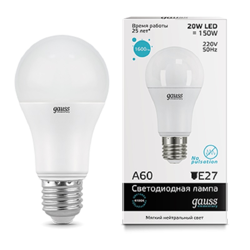 Светодиодные лампы Gauss серии Elementary это оптимальное сочетание цены/качества для освещения в жилых и бытовых зонах. Лампочки Gauss при потреблении электроэнергии в 20Вт эквивалентны 150Вт в лампах накаливания и обеспечивают холодный и яркий световой поток в 1750Лм. Данные лампочки используются в светильниках с глубоким плафоном и стандартным цоколем.
