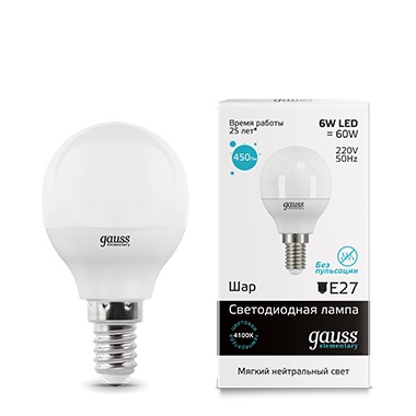 Лампа светодиодная Gauss Elementary G45 Шар E14 220В 6Вт 420Лм 4100К 45х82мм картинка