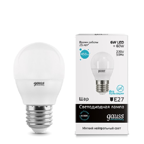Лампа светодиодная Gauss Elementary G45 Шар E27 220В 6Вт 450Лм 4100К 45х82мм картинка