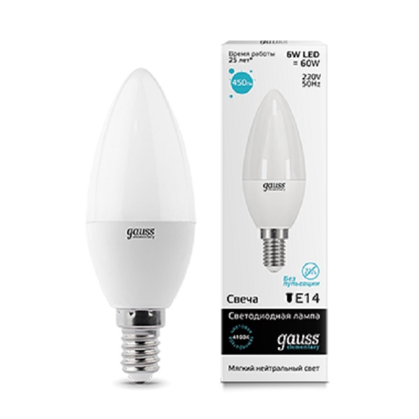 Лампа светодиодная Gauss Elementary С37 Свеча E14 220В 6Вт 540Лм 4100К 37х98мм картинка