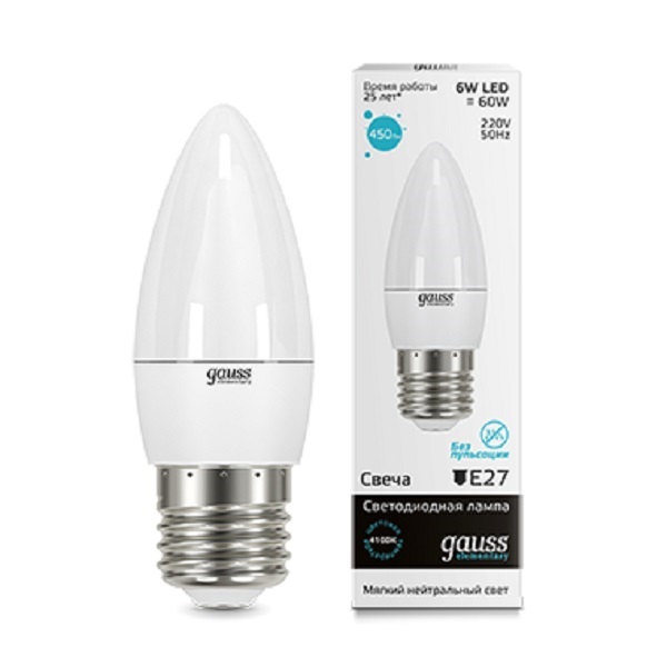 Продукция Gauss выполнена из экологически чистых материалов - не содержит ртути, свинца и фосфора, не выделяют токсичных веществ и не нуждаются в особой процедуре утилизации, Gauss мгновенно включаются, и имеет максимальную яркость с первой секунды - не требуют разогрева в отличие от КЛЛ. Gauss Elementary Candle имеет высокую цветопередачу, низкую температуру нагрева лампы, стабильную работу при перепаде температур. Срок службы светодиодной лампы Gauss до 35 раз дольше, чем у обычной лампы накаливания.