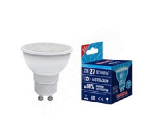 Светодиодная лампочка в форме полусферы с цоколем GU10 и размерами 55 мм по высоте и диаметром в 50 мм обладает мощностью в 10 W, благодаря чему она может осветить 3.3 кв.