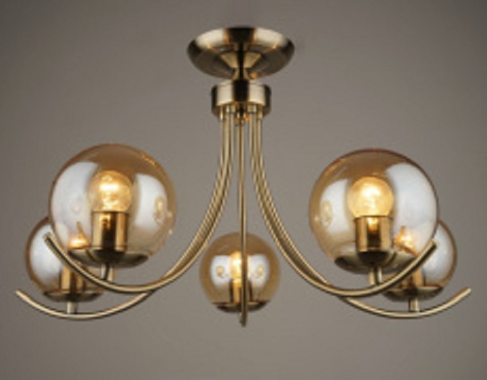 Простой и лаконичный дизайн люстры из пяти рожков с плафонами выполненными из стекла золотистого цвета гармонично подойдут в любое помещение: гостиную, спальню, детскую, кухню или столовую. Основание люстры сделано из металла бронзового цвета. В плафоны подходят светодиодные лампы, лампочки накаливания и энергосберегающие лампы с цоколем Е27. Люстра крепится при помощи монтажной планки, что обеспечивает плотное прилегание светильника к потолку или же навешивается на установленный в потолке крюк. В сочетании с бра и торшером создадут уют и комфорт в помещении.
