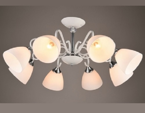 Классический дизайн люстры, из восьми рожков с белыми стеклянными плафонами, гармонично подойдут в любое помещение: гостиную, спальню, детскую, кухню или столовую. Основание люстры выполнено из металла белого цвета в виде изогнутых линий. В плафоны подходят светодиодные лампы, лампы накаливания и энергосберегающие лампы с цоколем Е27. Люстра крепится при помощи монтажной планки, что обеспечивает плотное прилегание светильника к потолку или же навешивается на установленный в потолке крюк. В сочетании с бра и торшером создадут уют и комфорт в помещении.