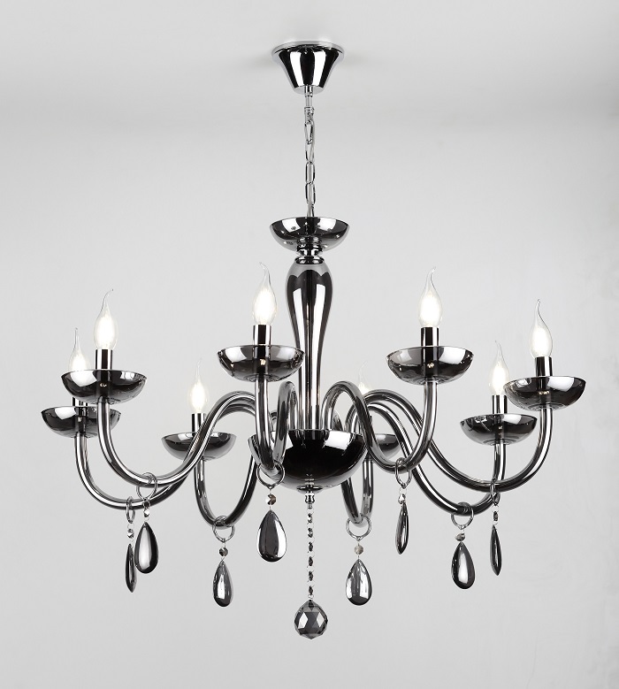 Изящная и стильная люстра выполненная в классическом стиле. Люстра выполнена из стекла покрытого стильным серым хромом, Затемнённые подвески-капли крепятся к каркасу при помощи небольших лаконичных колец. В плафоны подходят светодиодные лампы, лампы накаливания и энергосберегающие лампы с цоколем Е14. Люстра крепится при помощи монтажной планки, что обеспечивает плотное прилегание светильника к потолку или же навешивается на установленный в потолке крюк. Длину такой люстры можно легко настраивать самостоятельно изменяя длину цепи, на которой держится люстра. Гармонично подойдет в любое помещение: гостиную, спальню, детскую, кухню или столовую В сочетании с бра создадут уют и комфорт в помещении.