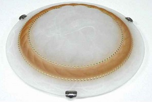 Арматура алюминиевая. Плафон круглый, выпуклый, диаметром 250 мм, из структурированного стекла, белого матового цвета с каймой золотистого и коричневого цвета.