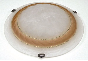 Арматура алюминиевая. Плафон круглый, выпуклый, диаметром 250 мм, из структурированного стекла, белого матового цвета с каймой золотистого и розового цвета. Монтажное отверстие диаметром 65 мм.