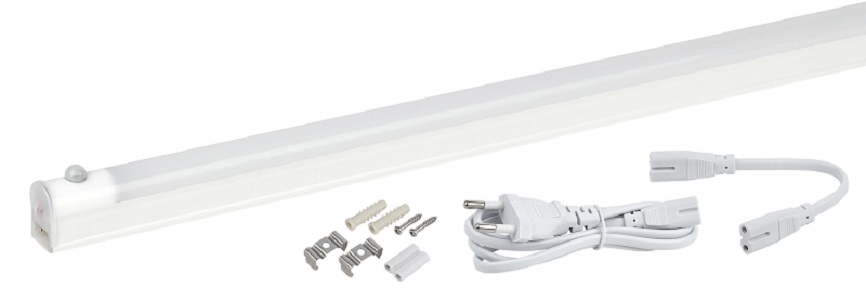Линейный светодиодный светильник LLED-02 с датчиком движения 8W 230V, в комплекте: светильник с датчиком движения, сетевой шнур с вилкой, крепеж для монтажа на вертикальную или горизонтальную поверхность, соединительные элементы для последовательного подключения светильников. Максимально допустимая мощность подключения в линию: 100 Вт.