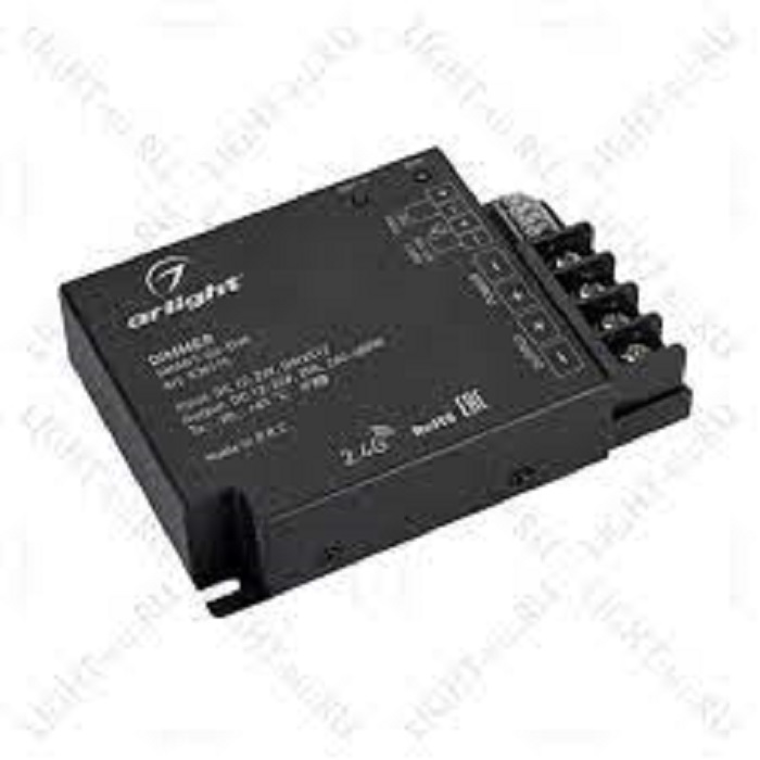 Диммер для монохромной светодиодной ленты (ШИМ). Входной сигнал: RF 2.4G, 0/1-10V, PUSH DIM. Питание/рабочее напряжение 12-24VDC, максимальный ток 20A на канал, 1 канал, максимальная мощность 240-480W. Винтовые клеммы, корпус - металл. Габариты 107x75x25 мм. Управляется пультами и панелями серии SMART