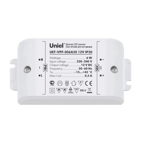 Блок питания для светодиодной ленты Uniel 12В UET-VPF-006А20 0,5А 6Вт IP20 Пластик
