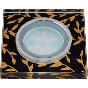 Входная частота, Гц - 50; Входное напряжение, В - 12/220; Диаметр выреза для монтажа, мм - 65; Диапазон рабочих температур, °С - +5 до +40; Класс защиты, IP - 20; Максимальная мощность, Вт - 35; Материал корпуса - стекло; Патрон - GU5.3; Применяемая лампа - светодиод/ галоген; Размер видимой части светильника, мм - 90*90*10; Размеры, мм - 90*90*20; Способ установки - Встраиваемый; Цвет базы - хром; Цвет корпуса - черный с декором; Цоколь - GU5.3