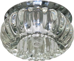 Основание круглое, из металла, цвета металлик. Диаметр 80 мм, диаметр монтажного отверстия 60 мм. Плафон стеклянный, сложной формы, декорирован под хрустальный.