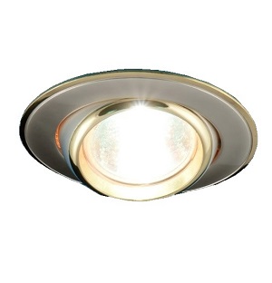 Корпус алюминиевый, с подвижной внутренней частью, цвета "никель", с золотистым ободом, гладкий, круглый, без декорирования по поверхности. Внешний диаметр 80 мм, монтажный диаметр 65 мм.
