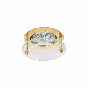 Основание изготовлен из металла, круглое, золотистого цвета. Плафон округлой формы, плоский, из стекла. Диаметр 90 мм, диаметр отверстия 65 мм, с цоколем GU5,3.