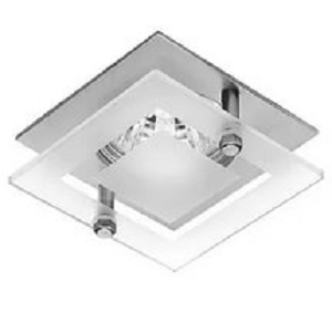 Основание изготовлен из металла, четырехугольное, серебристого цвета. Плафон квадратной формы, плоский, из матового стекла. Диаметр 90 мм, диаметр отверстия 65 мм, с цоколем GU5,3.
