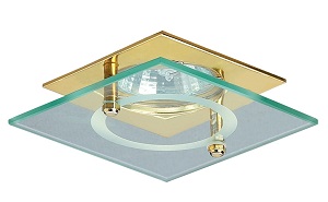 Основание изготовлен из металла, четырехугольное, декорировано под позолоту, блесятщее. Плафон квадратной формы, плоский, из прозрачного стекла. Диаметр 90 мм, диаметр отверстия 65 мм, с цоколем GU5,3.