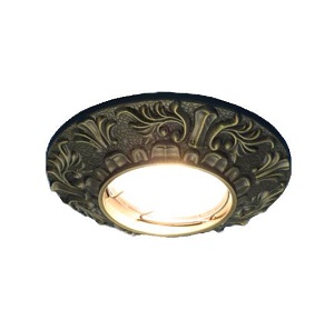 Плафон литой, из алюминия, рифленый, с имитацией барельефа, цвета состаренной бронзы. Диаметр 100 мм, диаметр отверстия 65 мм, с цоколем GU5,3.