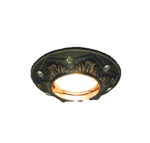 Плафон литой, из алюминия, рифленый, с имитацией барельефа, цвета состаренной меди, со вставками из стекла. Диаметр 100 мм, диаметр отверстия 65 мм, с цоколем GU5,3.