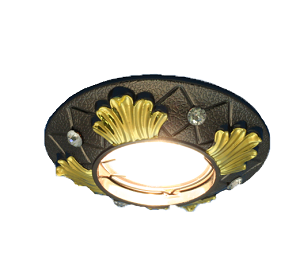 Плафон литой, из алюминия, рифленый, с имитацией барельефа, цвета состаренной бронзы, цвета состаренной бронзы, с узором, декорированным под позолоту, со вставками из стекла. Диаметр 100 мм, диаметр отверстия 65 мм, с цоколем GU5,3.