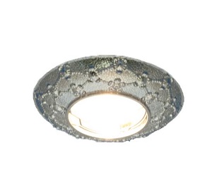 Плафон литой, из алюминия, рифленый, с имитацией барельефа, цвета темного серебра. Диаметр 100 мм, диаметр отверстия 65 мм, с цоколем GU5,3.
