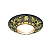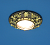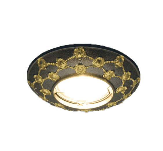 Плафон литой, из алюминия, рифленый, с имитацией барельефа, цвета состаренной бронзы, с узором, декорированным под позолоту. Диаметр 100 мм, диаметр отверстия 65 мм, с цоколем GU5,3. Применяется для декоративного освещения жилых и офисных помещений.